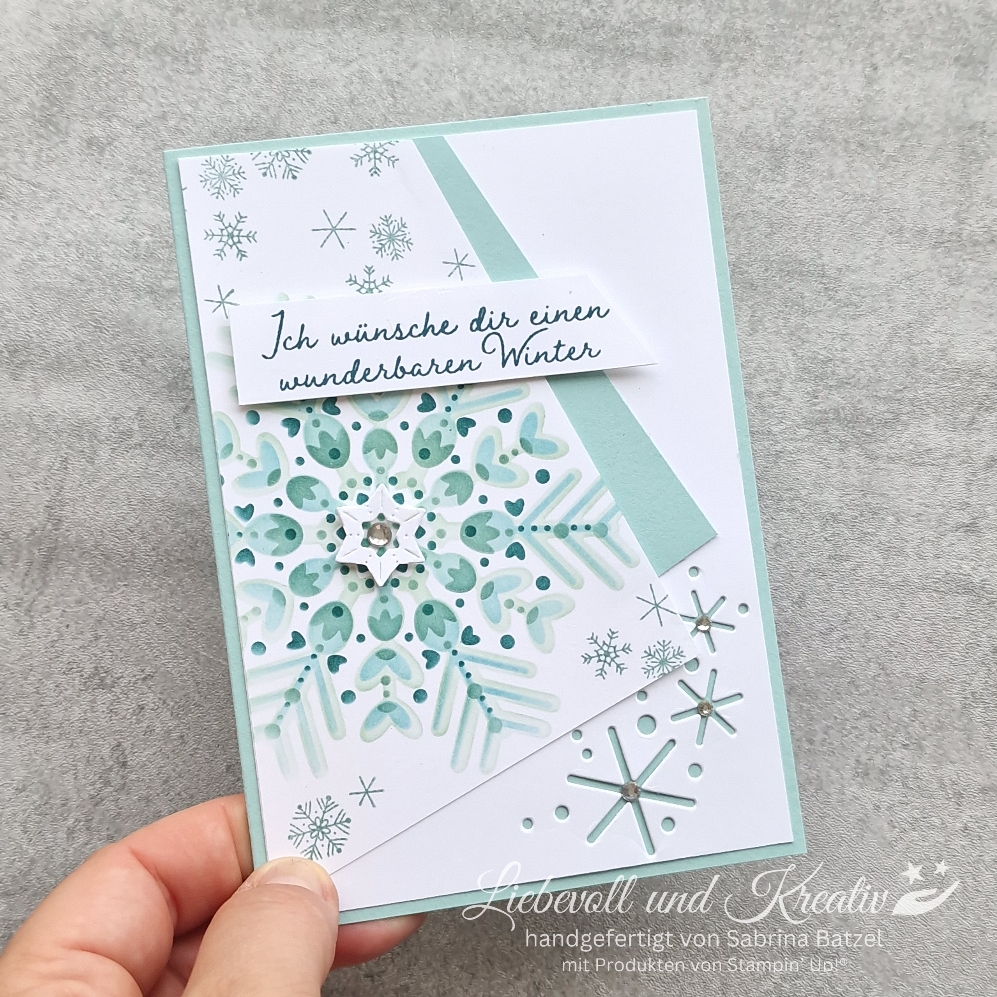 Die kleinen Schneeflocken und den Spruch findest du im Stempelset "Glitzernder Winter" und die ausgestanzten Flocken im Aufleger der Karte in den Stanzformen "Glitzernder Winter".